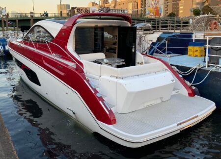 外観はこんな感じ。大きなサイズのプレジャーボートといえば2階に『フライングブリッジ』と呼ばれるヘルムシートを設ける傾向ながら、アメリカではX47のような『エクスプレス』と呼ばれるクーペのような速いタイプも需要ある。パワーユニットはランクル200などに搭載されていた4.5リッターのV8ディーゼルをヤンマーがマリン用に仕立てた370馬力×3基搭載。40ノットを出す。