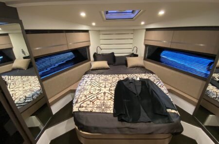 さすがイタリアの名艇を作るアジムの作だけにインテリアもステキ! 明るい色合いでまとめられており、ヘルムシートの後ろはシンクや冷蔵庫なども設置されたリビング。ヘルムシート横の階段を降りていくと、外から見えないリビングスペースになっている。正面にトイレ&シャワー付きメインベッドルーム(下の写真)。後方はゲスト用のベッドルームがあります。