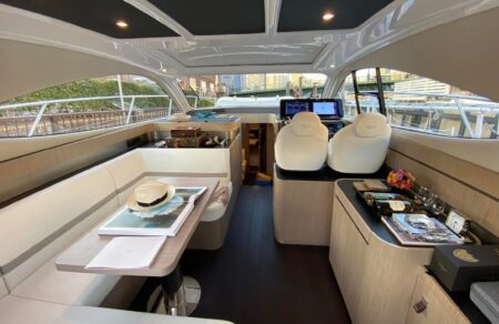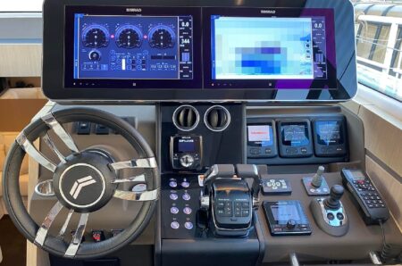 そんなヤンマーが突如イタリアのアジムと一緒に、カッコ良い47フィートのフネを作ったのだった。上はヘルムシート(操船席)。左液晶画面は3基搭載しているエンジンの状況。右が海図やレーダーなど。2本のレバーがスロットル。右下のジョイスティックは倒した方に微速で動く(横だけでなく斜め前方にも平行移動可能)。その上の小さいレバーは通常のバウスラスタ。1億8千万円の運転席だ。