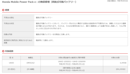 電池は三元系リチウムで、内部損傷や生産時の不具合により発火する可能性がある。実際、以下の通り6月30日にリコールを出している。「バッテリー内のセルと構成する部品の溶接条件が不適切なため、損傷したセルから電解液が漏れるものがあります。そのため、そのまま使用を続けると、漏れた電解液により金属が析出し短絡して、セルが発火し火災に至るおそれがあります」。