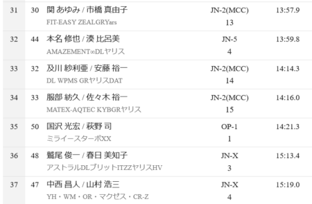 単独だと速いかどうか解りにくいので、少し前に戻して見ていただれば、と思う。何より乗っていて楽しいし、伸び代を持ってるのもワクワクします。最終リザルトは出走49台。完走38台というリタイア多い厳しいラリーだったにも関わらず全くトラブルなし(課題は多し。笑)。終わってみたら33位で、どうにか全日本ラリーの仲間に入れてくれそうな結果となった。