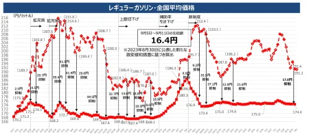 為替は9月5日で143円台。原油の先物相場といえば中東の騒乱と需要期の冬を迎えるのに下落傾向。7月にWTIはバレル85ドル近くまで行ったのに、今や70ドルを下回っている。バレル85ドルで為替160円なら1万3600円。現在1万円。本来なら30%近く下がって当然だ。なのに全国のガソリン平均価格は7月から1円しか下がっていない174円! そして補助金が16.4円も出てる。