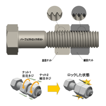 海外ではISO起因の緩み防止のため、様々な対策をとっている。下は欧州。締めた後、こういったキャップをはめておくことで緩んでいることが目視で解る。ただ従来のネジだと緩みを完全に防ぐことは出来ない。何とかしたいということで考えられたのが、パーフェクトロックボルトだ。ぱっと見、Wナットなのだけれど、実はボルトのピッチが2種類刻まれている。