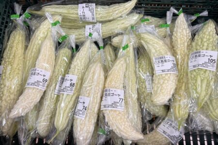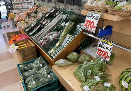 野菜だけれど確かに品種は減っている。上は同じスーパーの17時過ぎ。とりあえず野菜不足で困るような状況ではありません。加えて島の中でも農作物採れる。皆さんこのときとばかり店に持ってきて並べてます。「島ねり」(おくら)こそ名産品のため良い値段ながら、ジューシーで美味しい「つるむらさき」はけっこうな量で150円。島ゴーヤは100円以下。