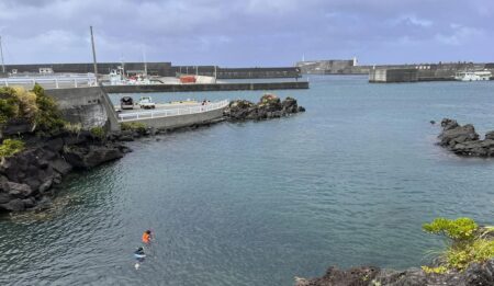 台風来襲前日ながら海遊びも可能。さすがに外海に面した海外は全て立ち入り禁止となっているものの、写真の神湊港内のみ穏やか。強固な防波堤の内側のため、越堤しない限り波なし。加えて風裏のため風も無い。驚くべき事に港の中ながら透明度抜群! 水深5mくらいまでは見えるし魚種だって多い。子供の遊びには文句なし。ということで写真は12日の夕方です。