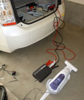 床上浸水してもエアコンは壁の上にあるので、水につかることは避けられる。車もジャッキでちょっと持ち上げておけば助かるかもしれない。そしてインバーターの出番。