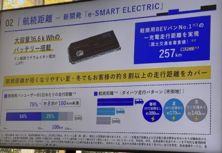 ダイハツの軽電気商用車e-ハイゼットに試乗した。興味深かったのは航続距離。国交省の審査値だと257km。されどダイハツの市街地走行パターンはエアコン無しなら300km。夏場30度のエアコン使用で170km。冬場5度でヒーター使ったら140kmという。いろんな意味で驚く! 国交省の審査値、軽電気商用車の航続距離の目安にはならない(笑)。メーカーは正直だ。