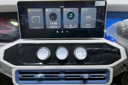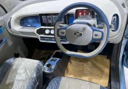 写真の通りインテリアはなかなか凝っていて楽しい。少なくとも価格コンシャスな日本の軽自動車よりずっと夢がある。液晶たくさんあるし、センター液晶の左側のスペースは光る。タイで販売しようってんだからエアコン標準装備。しかも右ハンドルときた。この手の中国製小型電気自動車で右ハンドル仕様車が確認されたの、初めて。日本で売るとしたら120万円ってイメージ。