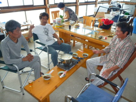 本場の五島で地獄炊き中。鍋とコンロとつゆと卵とカツオ節