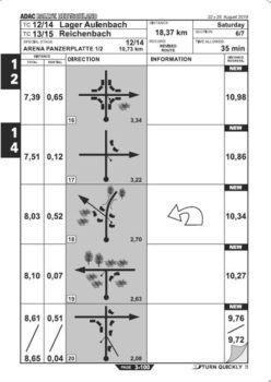 <Panzerplatte Shortのルートブック。16図は『全長10.73kmのSSの7.39km地点が16図で、そこを右に行きなさい。前のコマ図からの距離は650m, ステージの残りは3.34km, 次のステージの入口TCまで10.98km。ここは今まで使っていない新しいステージですよ』という説明です。ルートブックに普通は石なんて描いてありませんが、ここのステージだけは交差点のヒンケルシュタインや牛石もこんな感じで描いてあります。どこの交差点もこんな感じなのでショートカットなんて出来ません。18図のINFORMATIONに描いてある矢印は、『ここから丘陵地帯風道路を外れてくそ道だぞ』という情報です。一番下のTURN QUICKLY!!は『次のコマ図が直ぐに出てくるからルートブックを早くめくらないとミスコースするぞ!』という情報です。レッキではこれを見ながらペースノートを書いていきます>