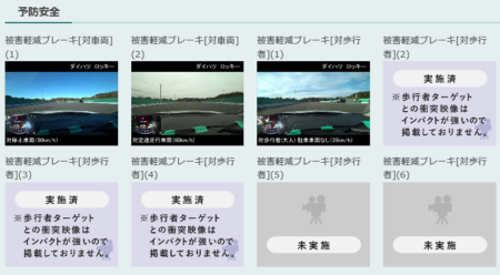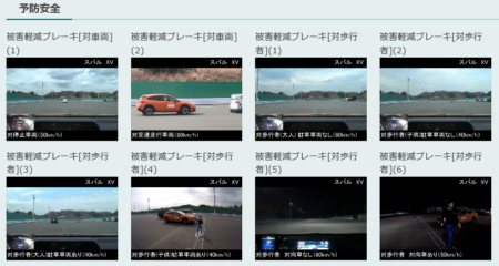 見通しの良い条件の歩行者ですら35km/hから止まるのがやっと。歩行者(2)は子供ダミーなのだけれど、全く止まれずハネてしまっている。右下の2つは車両の陰から歩いて出てくる試験。これまた止まれずハネ飛ばしてしまった。ちなみに下は2017年発売のスバルXV。アイサイトとして考えたら旧世代に属す。それでも見通しのよい状況だと60km/hから停止可能。