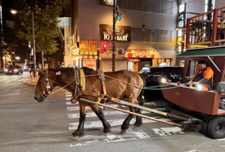 帯広でカーボンニュートラルの実証実験をやっているというので見に行きました。いやいやこんな大きな街中でやるとは予想も出来ず。クルマたっくさん走っているし、信号もあれば歩行者もいる。果たして待ってると「来ました!」。少しばかり馬には詳しい私ながら(3年間ほど馬術やってました)、外観はブルトンという輓馬レースに使われる馬種に見えるが大きい。不明です。