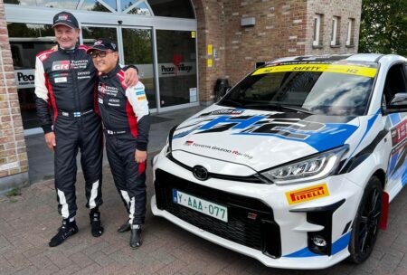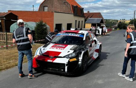 SSのフィニッシュで待っていたら水素エンジンGRヤリスの運転席にモリゾウさんが座ってる! 出走順は00カーの前でMIRAIで走った私の時と同じ。ヘルメット被って全開走行が許されているものの、横断する歩行者などもいる。ペースノートだって自分で作っていないためぶっつけ本番。加えてターマックラリーで一番難しいと言われるベルギーときた!