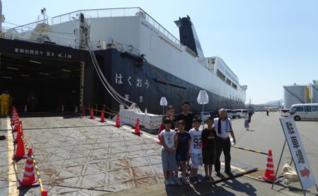 外洋ではくおうと勝負したら絶対勝てない! 通常は明石に停泊しているのだけれど、24時間で1300kmくらい移動可能。素晴らしいのはトラック120台+乗用車80台を運ぶ能力持つことだ。そして全長200mを切る199,5m。200mを超えると「巨大船」という扱いになり気軽に運航できない。大出力スラスターを持つため離着岸時タグボート不要。速くて荷物運べてどこにでも行ける!
