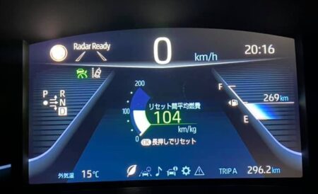 水素消費量は1kgあたり95,1km。表示される平均燃費と違うけれど、車両表示の方が正しいかも。先代MIRAIの時もそうだったけれど、水素ステーションによって充填される圧力は違うようでバラつきます。ちなみに104km/kgという燃費はどうか? 水素1kg=1210円だからガソリン10Lに相当する。大雑把に考えると10,4km/Lのエンジン車と同じ感覚の燃料コストです。