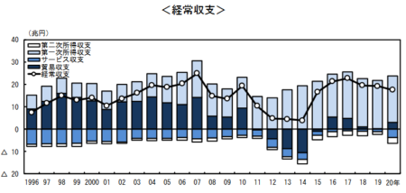 我が国が貿易立国だと勘違いしている時代遅れの人って案外多い。下のグラフは日本の対外経常収支。平均すれば15兆円程度のお金が日本に貯まり続けている、ということ。超健全と言って良かろう。黒字をもたらしているのは、2005年まで貿易だった。下のグラフだと濃い青のブブンです。原料を輸入し、製品にして輸出するというもの。これで得たのが貿易黒字。