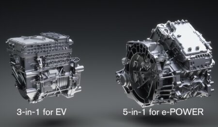 日産は電動化に向けモーターと減速ギア、インバーターが一体構造となった電気自動車用の『3-in-1』と、そいつに発電機と増速機を加えたeパワー用の『5-in-1』というパワーユニットを開発していると発表した。現在のコストを30%引き下げ、結果的にeパワーがエンジン+ギアの車両と同じくらいになるという。また、高価なモーターに使う希土類も重量比で1%以下に減らせるそうな。