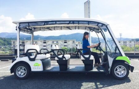 ここにきて様々なモビリティが公道に出現している。地方自治体や大手企業であれば、どんな車両でもナンバー取得出来るようだ。下は大阪府の河内長野市で実証実験を始めた南花台モビリティの「クルクル」。ヤマハ製の7人乗り電動カートを使い、登録は乗用車の5ナンバー。最高速12km/h。ゴルフ場のカートと同じく、基本的に自動運転となり、緊急時のみ人間が操作する。