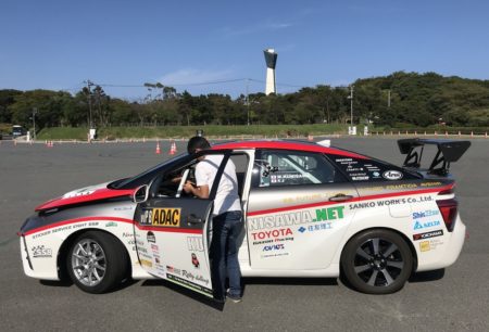 私はMIRAIの同乗試乗です。今回は頑張って今日と明日で80人のワクを作りました。一生懸命走っていたら、初日の午前中で前輪減っちゃいました~。午後は後輪を前に履き、リアを標準タイヤに。だからホイール違う。前後のグリップ差あるため、限界こそ若干低いが面白いくらい曲がってくれます。曲がるクルマ、楽しい! 喜んだ顔を見るのはジジイにとって最高の贅沢だ。