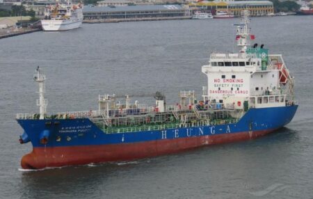 事故の状況から考えると白虎の真横に蔚山パイオニアが”ほぼ全速”で衝突したようだ。衝突後の写真を見たら蔚山パイオニアの船首は完全に潰れており、一方球状船首(強固な構造です)のみ付き出たまま。下の写真は荷物を積んでいないため球状船首が見えているけれど、衝突時は酢酸を満載しており、赤く塗られたあたりまで沈んでいたと思われる。