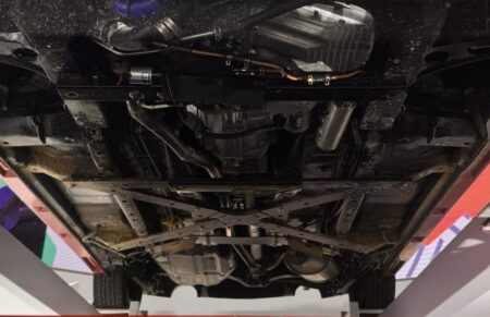 床下はこんな感じ。下回りをそっくり移植したためリアサスもリジット。相原さんに聞いたらこの状態で走ってみたという。ラリー車のコペン、ミライースのラリー車と比べると低重心なのでコーナリングスピードは高いそうな。試作車はコペンよりさらに低重心のため、一段と気持ちよいらしい。加えて後輪駆動! イマドキこんなクルマが出てくるなんで素敵だ!