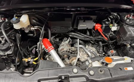 ボンネットを開けるとエンジンが見えない! 電気自動車だと思う人も多いそうな。ハイゼットのエンジン、床下にあるため60度傾けて搭載されている。そのまんまコペンのボディに搭載すると下の写真のようになっちゃう。シリンダー、右方向に60度傾いている。エンジン後方にある5速ミッションからリアに向けてドライブシャフトが伸びており後輪を駆動する。