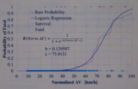 レクサスLSに採用されている技術、全て紹介しきれていないそうな。ナンテコッタ! 下は論文に使われている表の1つ。60km/hを過ぎたあたりから死亡率が急上昇している。そして車速を10km/h下げると死亡率は半分になるのだった。80km/hで衝突したら68%死亡するが、70km/hだと35%くらいになります。75km/hなら50%の死亡率で、65km/hだと22%といった具合。