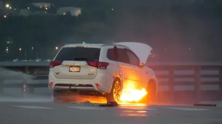 日本車に限って言えば海外の例だけれどアウトランダーPHEVも水没後に燃えている。こちらは水深6mくらいに沈んだ直後に引き上げたら燃えたというもの。両ケースに共通するのは、バッテリーケースの中へ中途半端な量の水が入ったという点。完全に水没してしまえば問題無いと言う。リーフの場合、屋根くらいまでの水没。アウトランダーPHEVだと高水圧&短時間の水没だ。