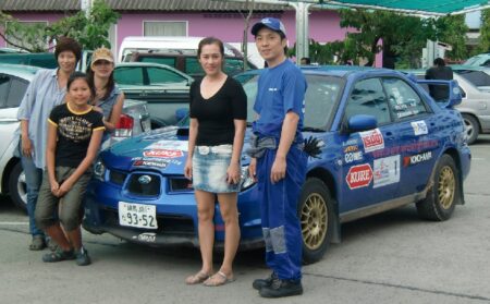 ところが車両のダメージ大きく、なかでもクラッチがオシャカに。されど予算なくアタマを抱えていたら、東京スバルでクラッチを含む壊れたパーツとメカニックを派遣してくれるという! ということで青木君です。バンコクに到着するや気温35度のエアコン無しピットでクラッチ交換。タイに派遣するくらいだから腕利きなのだった。その後、日本語も英語もしゃべれないタイ人と合流。