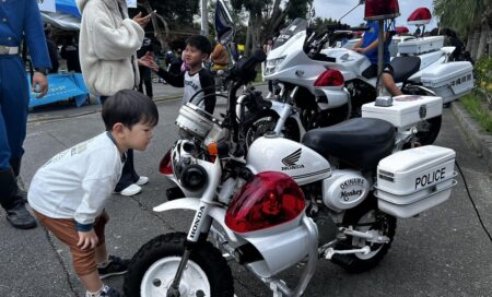 サービスパークとなったコザ運動公園はクルマ関連の店舗や体験コーナー、水素関連の環境技術紹介コーナーなど作られており、ちょっとした規模のお祭り会場になっていた。那覇県警が作ったモンキーの白バイ(本物の白バイ用のサイレンやメーターを移植。隊員達が作ったそうな)、子供に大人気でした。こういった展示にも米軍など参加してくれたら楽しい。
