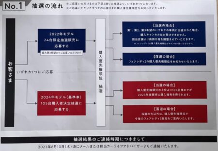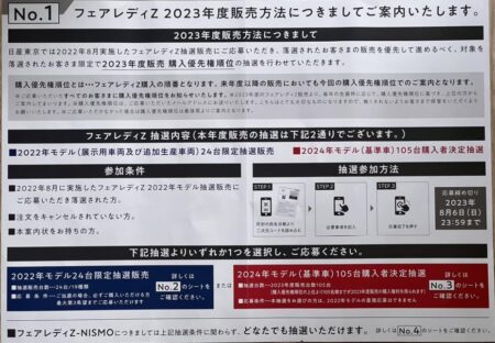 どうなってるんだ、と思っていたら、東京日産からお手紙が届いた。「2023年度販売方法についてのご案内」だという。内容は真夏の怪談らしく複雑怪奇。なんでも2022年に作った24台を抽選か、2024年モデル105台の抽選か選べと言う。「坊ちゃんはずれ~」の場合、購入優先権順位を教えてあげるということらしい。そして「注文をキャンセル」という項目もある。
