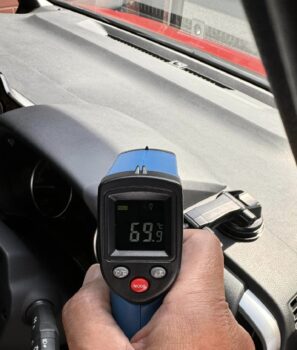 ノアのフロントガラスは熱反射じゃありません。ということでダッシュボード上の温度を測ると69.7度! タマゴの黄身(タンパク質)が固まる温度の70度に限りなく近い。もちろん触ればヤケドする。こんな温度でダッシュボードの樹脂はよくぞ変形しないものだと感心しきり。ここに携帯電話でも置いておいたらリチウム電池が発火する可能性ある。