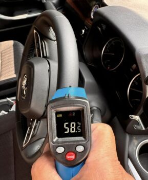 ハンドルも黒いため熱いかと思ったら、素材の問題なのか60度に達していなかった。もちろん十分熱いですけど。炎天下に駐めておいたクルマに乗った直後は、シートでアチチ。ハンドル握ってアチチになる。日が当たる場所に30分以上駐車するならサンシェードを使うことを強く強く推奨しておく。参考までに書いておくと、車内の温度は55度くらいでした。