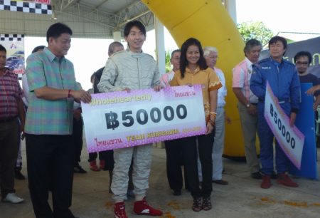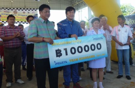 2011年にタイで大きな水害が発生した。ラリー開催地ということで心配していたら連絡あり「日本人が来てくれたら元気になるから走って欲しい」。だったらと読者の皆さんに寄付をお願いしたら、130万円ほど集まった。それを現地に伝えたところ「すごく嬉しい!」。私のポケットマネーを加え45万バーツ(約144万円)を6口に分けて寄付することにしたのであります。