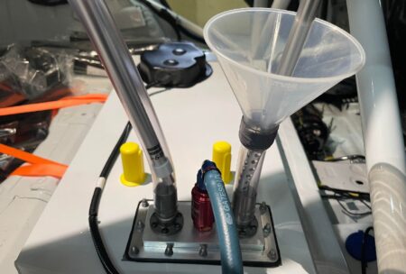 ちなみに安全燃料タンクへの給油は専用アタッチメントが必要。聞いたら40万円以上するという! 今年は2回しか出ないのに! 本国に注文したがしばし時間掛かるそうな。そこで喜多見さんが簡易給油装置を「発明」しました。「絶対に入れられないよ」と言われていたのに、給油バルブに全く傷付けることなくするする入っちゃう! これでシェイクダウン出来る!