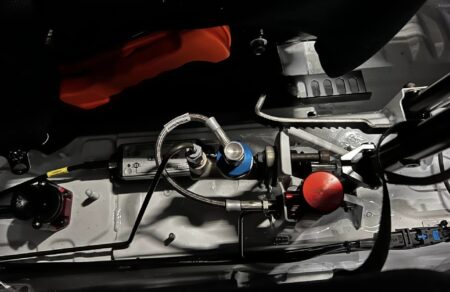 運転席回りはノーマル部品がけっこう多く使われている。ステアリングやベルト、シートなどサベルトでお揃い。ハンドル右がシートフレバー(赤ぽっち押して前に押せばバックギア)で、その横にサイドブレーキレバー。前後のブレーキバランスは手元で調整可能だ。ノーマル車をベースに、スポーツ走行するためのパーツだけ交換している感じ。