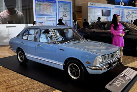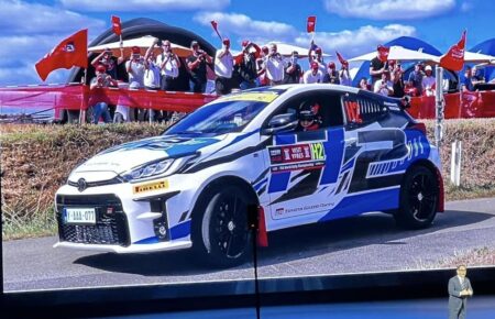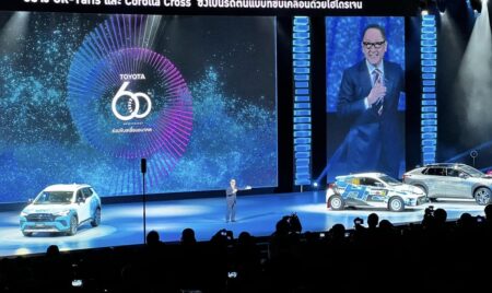 さらにタイでハイラックスを開発した時は「日本で間に合わないと言われたがタイの拠点が頑張ってくれて間に合った。タイの仲間に心から感謝してます」。最後は環境対応の話なる。私も驚いたのだけれど、このイベントのために水素エンジンカローラやWRCで走らせた水素エンジンGRヤリスをタイに持ち込んでいた。そして「電気自動車に限らず全方位で取り組んでいきたい」。