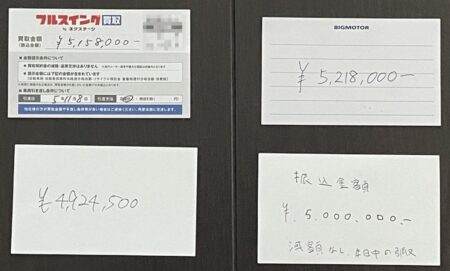曰く「3社の勝ち残りは必ずデタラメな価格を付けてくる業者がいます。そしてウチが一番高いと言って難癖付けて引き下げた価格で持って行くんです」。そして「どこにも負けないです」と言って、ホントに一番高い値を付けてきた。十分に納得できる価格だったので売りましたね。ビッグモーター、もしかすると少数精鋭店舗は生き残るかもしれません。やはり仕事出来る。