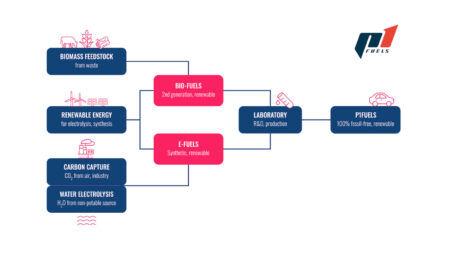 下の表をクリックしていたくと大きく見えるようなります。左側に描かれている素材は上から「動物の排泄物や繊維などゴミ」。続いて「太陽光や風力など自然エネルギーを使った電力」。そして「二酸化炭素や水から作る水素や酸素など」を合成している。いわゆるゴミ由来のバイオフューエルと、化学合成で作られるeフューエルを混合して調整するというもの。