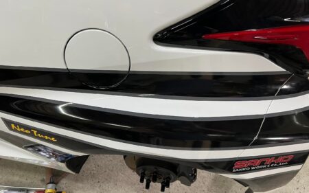 カッティングシートのデザインは日産デザイン部長である木原さんによるもの。プロなのでブリスターフェンダーにラインを入れるという難題! 横からだと等間隔に見えるも、上から見たらこ~んな感じ。凄いのは「このあたりに貼って下さい」と植草君に注文を付け、その通り貼ったら見事に等間隔! やっぱし自動車メーカーのデザイナーの感性って凄い!