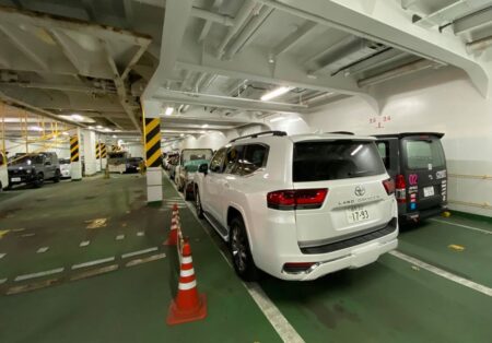 大洗からフェリーに乗り、離岸したタイミングで電話。知らない番号です。出るとトヨタの人で「ランクルのアラームが鳴っていますけれどクルマはありますか?」。なんと! 広報車のデータが入ってくるらしい。最下層から2つめフロアのためGPSは使えないハズ。おそらく電波などで常時位置確認できるんだと思う。エンジン掛かってないのに動き始めたためアラーム鳴ったんだと思う。
