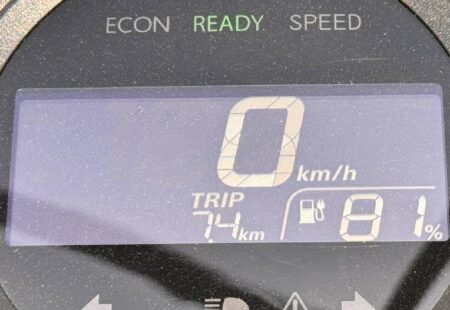 長い前置きになった。まず乗ってみなくちゃ、ということで試乗する。最高速は45km/hらしい(原付の最高速は30km/hなので公道だと試せない)。上は練馬周辺の交通量少ない道を流れに走った時の数字。全く気を遣わず走って航続距離35kmといったイメージ。走りは当然ながら滑らか。質感もスタート時に「ジジ」というコギングが残っているのを除けば静かです。