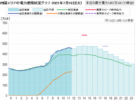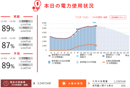 7月18日は本来なら電量需給状況が逼迫してもおかしくない。東北以北を除き全面的な35度を超える酷暑! エアコンはフル稼働(夏休み前なので学校もエアコン稼働)。連休明けて工場の立ち上がりにも電力を使う。本来なら全国規模で節電要請などあってもおかしくないと思う。下は一番キビシイと思われている東京電力管内の14時過ぎの状況。