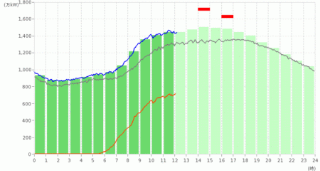 供給能力6293万kWに対し需要5540万kWで余力十分。東京電力管内は全面的な晴天じゃ無いものの、1139万kW(原発11基分に相当)を太陽光発電でカバーしている。御存知の通り東京電力は太陽光発電で作った余剰電力の買い取り価格を極めて安く設定するなど、太陽光発電の普及に思い切りブレーキ踏んでいるのに、20%を占めている。適性価格で買えばもっともっと増えるだろう。