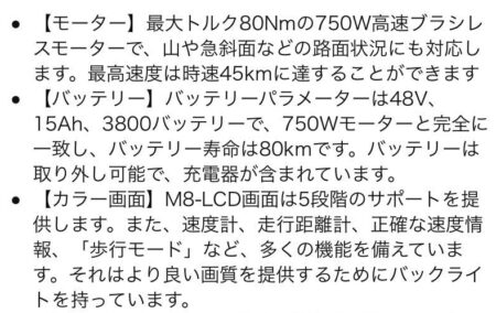 次なる電動自転車は750Wモーターを採用し12万5500円。ペダルアシストモードとフル電動モーターを切り換え可能になっており、ペダルアシストモードなら自転車扱い。フル電動で走るならナンバー取得する旨が書かれている。とはいえ簡単に切り換えられるようになっており、フル電動で走っていてもペダルを回していたら外から判別することなど出来ないと思う。