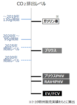 ここまでは余裕ある話です。次のCAFEは2025年に予定されている。これをクリアしようとしたら、全てをプリウスのレベルにしなければダメ。もっと正確に書くと、新欧州燃費基準WLTPは厳しい。新型ヤリスハイブリッド、日本基準なら65g/kmながら新欧州基準だと85g/kmになってしまう。ということでトヨタもPHVや電気自動車を多数投入しなければならないことは織り込み済み。