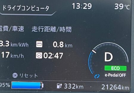 考えてみたらエンジンルーム、いやモータールームに発熱源が無い。エアコン用のラジエターにとっちゃ素晴らしい環境なんだと思う。39度でこんな効くエアコン、初めてだ。電気自動車に乗り始めて10年以上経つけれど、エアコンが効くというのは考えたこともありませんでした~。まだまだ知らないことがある。修行不足だ。39度になるとさすがに電費は5%くらい落ちますね。