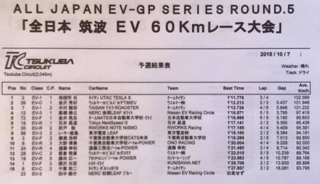 スタートは予選走ってないリーフが後ろにいるだけで、まぁドンベです。先頭車両、遠い。レースは60kmのため30周。台風去って熱気押し寄せる筑波の気温34度。いろんな意味で厳しいレースになること間違いなし! ポールポジションは昨年私が乗っていたテスラ・モデルS。ちなみに1分11秒776で、私が昨年出した1分11秒065は未だ破られていないコースレコードです。