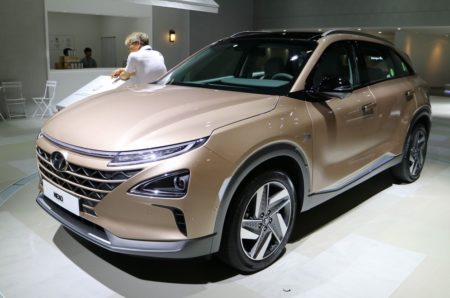 現代の燃料電池クロスオーバーSUV『ネクソ』。今年の1月にラスベガスで開催された『CES2018』にも出展されていた。水素タンクを3つ搭載し、600kmの航続距離だとアナウンスされている。SUVタイプの方が水素タンクを搭載しやすいかもしれない。補助金を使えば350万円で買えるという。
