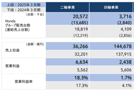 2輪メディアはメーカーの批判をしないというのが約束なので全く触れないけれど、ホンダ、電動化でベトナムや中国に代表されるアジア勢に大きくリードされているように見える。何度か書いてきている通り、ホンダの収益に於ける2輪の依存度は高い。下は2024年4月~2025年3月までの数字。営業利益は2輪の6634億円に対し4輪2438億円といった状況だ。